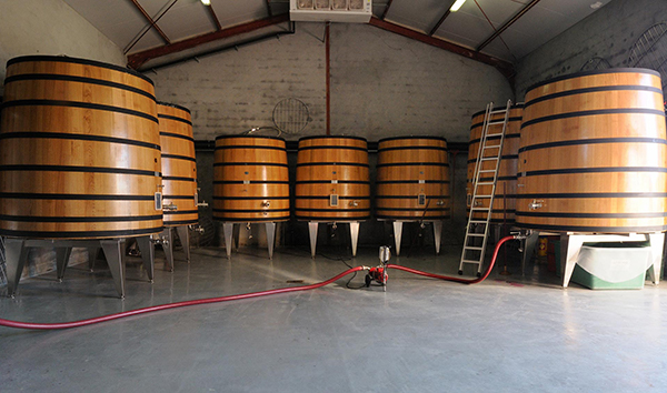 På vingården används enorma ektunnor som rymmer upp till 6 000 liter. De tempererade tunnorna är konformade och öppna upptill. Här börjar den första jäsningen.