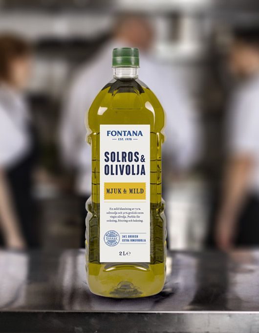 Som du säkert har noterat har priset på olivolja dragit iväg till följd av dåliga skördar runt Medelhavet. Hur gör vi då, vi som fortfarande älskar olivolja och inte vill ersätta den? Tillsammans med Fontanas kloka leverantörer i Grekland har de tagit fram en mild blandning av 70 % solrosolja och 30 % extra virgin grekisk olivolja. Oljan är som gjord för stekning, fritering och bakning (1 dl olja ersätter 100 g smör när du bakar). Men tonen av mjuk och mild olivolja gör att den också kan användas i sammanhang där smaken är viktig. Fontana Solros- och olivolja är en ovanligt god matolja som också har ovanligt många användningsområden.
