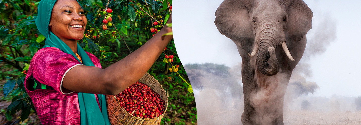 Stötta kvinnliga kaffeodlare och afrikanska elefanter med Arvid Nordquist kaffe