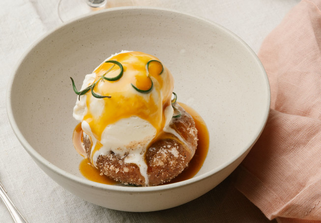 En nytolkning av den svenska kanelbullen där den friteras gyllene och serveras tillsammans med en kula SIA Glass Äppelpaj. Den varma bullen kontrasterar mot den svala glassen och toppas med en rosmarinkolasås. En dessert som kombinerar trygg nostalgi med en oväntad och elegant twist.