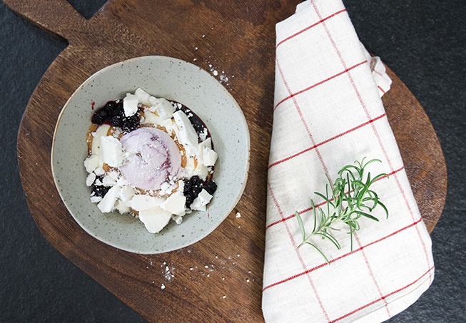 En klassisk marängsviss i ny kostym, baserad på SIA Glass "Gräddglass blåbär". Här tar vi inspiration från skogens smaker och härliga aromer. En blåbärssviss med blåbärsglass, bär, grädde och rosmarinmaränger.