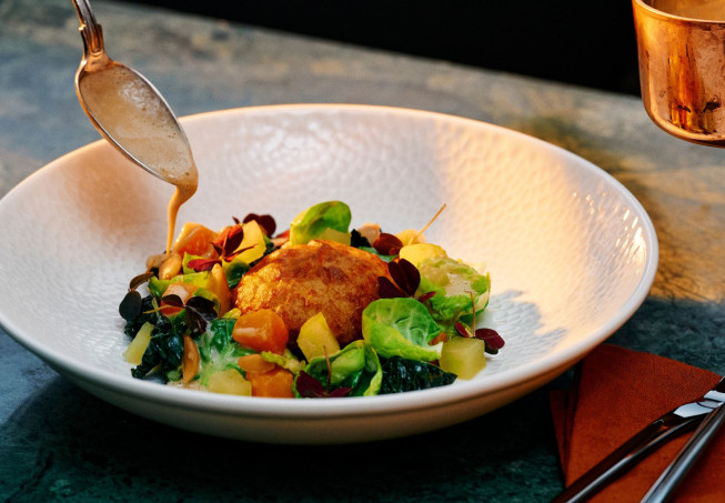 Det här är en gammal krogklassiker som alltid säljer bra när det återfinns på menyn. Här i en ny vegetarisk tappning där kroppkakan friteras och fylls med pumpa. Tjärsirapen ersätter rökigheten som traditionellt finns i fläsket och äpplet blir en ny tolkning av det klassiska lingonet. Under vår och sommar kan kroppkakorna fyllas med sparris, under hösten med svamp och på vintern med pumpa, som receptet nu föreslår.