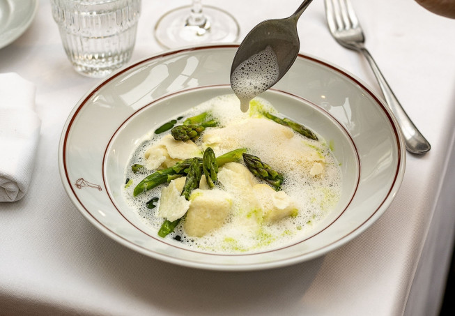 Italienska gnudi – ricottabollar med parmesan – serveras med grön sparris, luftigt parmesanskum och frisk ramslöksolja. Toppas med hyvlad pecorino.