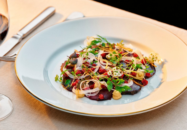 En carpaccio i ny tappning där smakerna av grillad rödbeta lyfts fram på ett elegant vis. Tillsammans med rostad grädde, krispig potatis och isad silverlök blir rätten komplett.