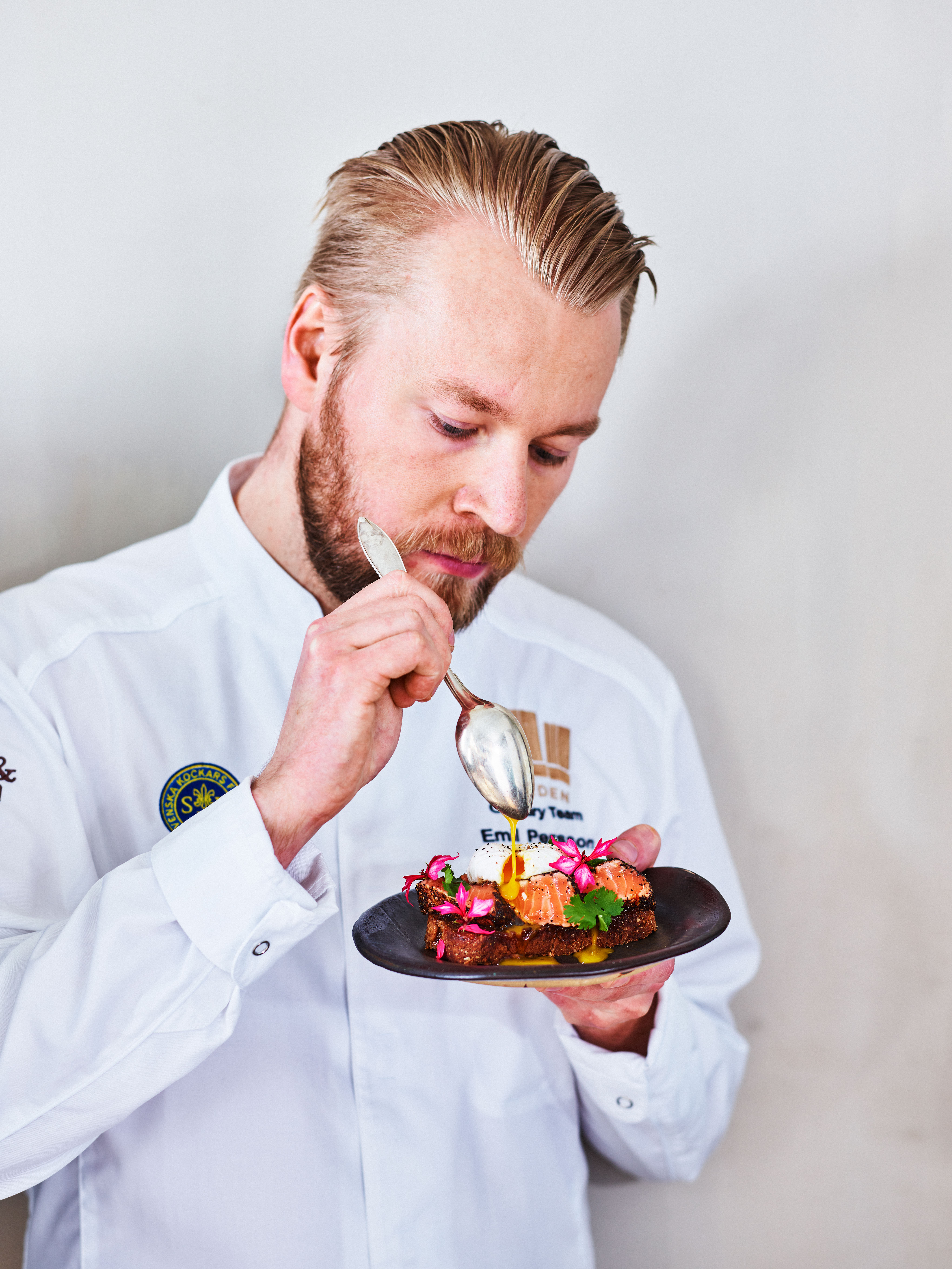 Emil Persson från Svenska kocklandslaget har skapat en rätt smaksatt av kaffe.