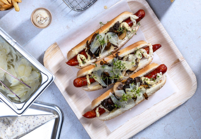 Värm korvbröden, lägg i korv, toppa med senapsmajonnäs, svamp och picklad fänkål.