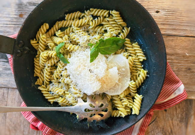 En enkel och smakrik grön rätt som snabbt blir en favorit på menyn. Med få, prisvärda råvaror och mycket umami får du en smakfull pasta – toppa med en riktigt bra svensk ost. Små detaljer gör stor skillnad.