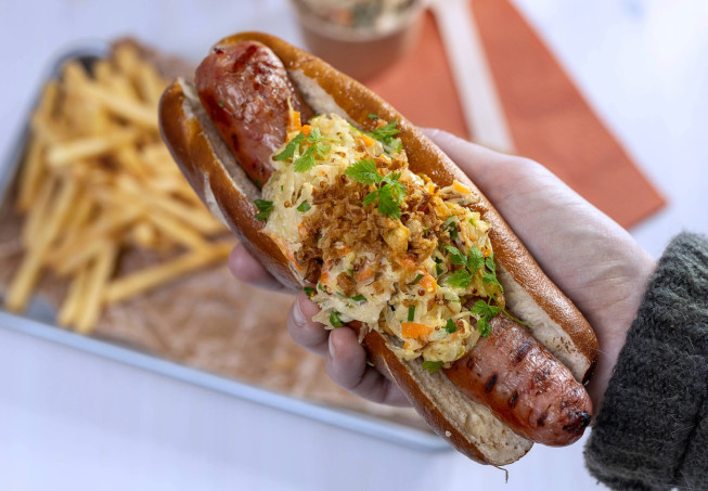 Värm korvbröden. Lägg i korven, toppa med surkålslaw och rostad lök.