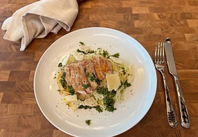 Svensk pasta med en långsamtväxande kyckling ger komplexa men samtidigt eleganta smaker. Här får pastan sällskap av kålrabbi och savoykål och smaksätts med citron och smör. För att nyansera smakerna mer så toppas det hela med libstickagremolata och vit caprin.