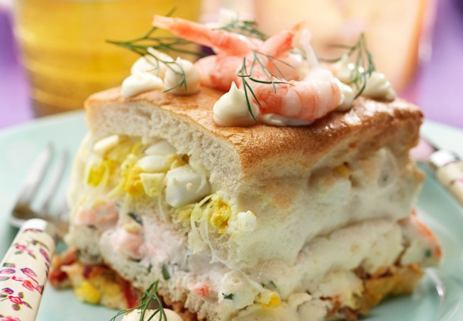 Tips: Smörgåstårtan kan med fördel tillredas dagen innan men avvakta då med ägg och majonnäsfyllningen tills tårtan skall gräddas i ugn.