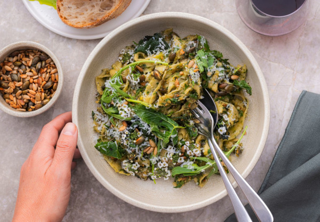 Blanda pastan och några matskedar av pastavattnet med peston.