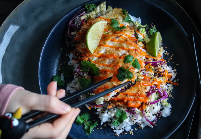 Skär tonkatsun i strimlor och servera med ris, kålsallad och toppa med srirachamajonnäs, koriander och lite lime att pressa över.