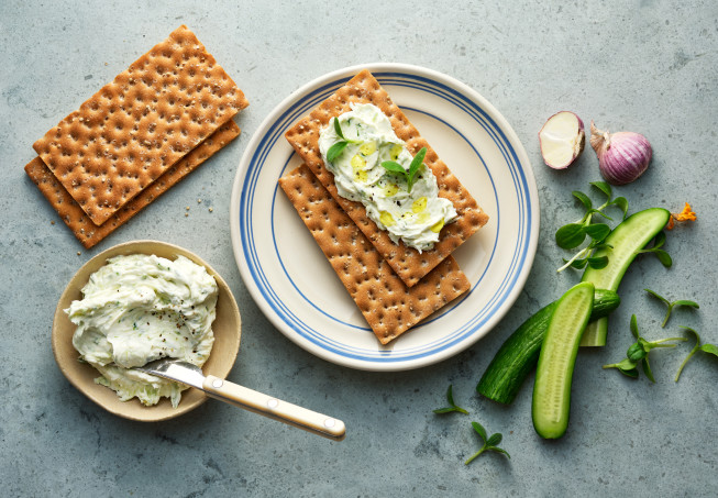 Tzatziki spread, på cream cheese, riven gurka och vitlök. Fräsch och smakrik spread med en känsla av Grekland. Den är enkel att tillaga och är perfekt på knäckebrödet! Passar utmärkt till Tunn Vete, Wasa 100 eller Tunn havre.