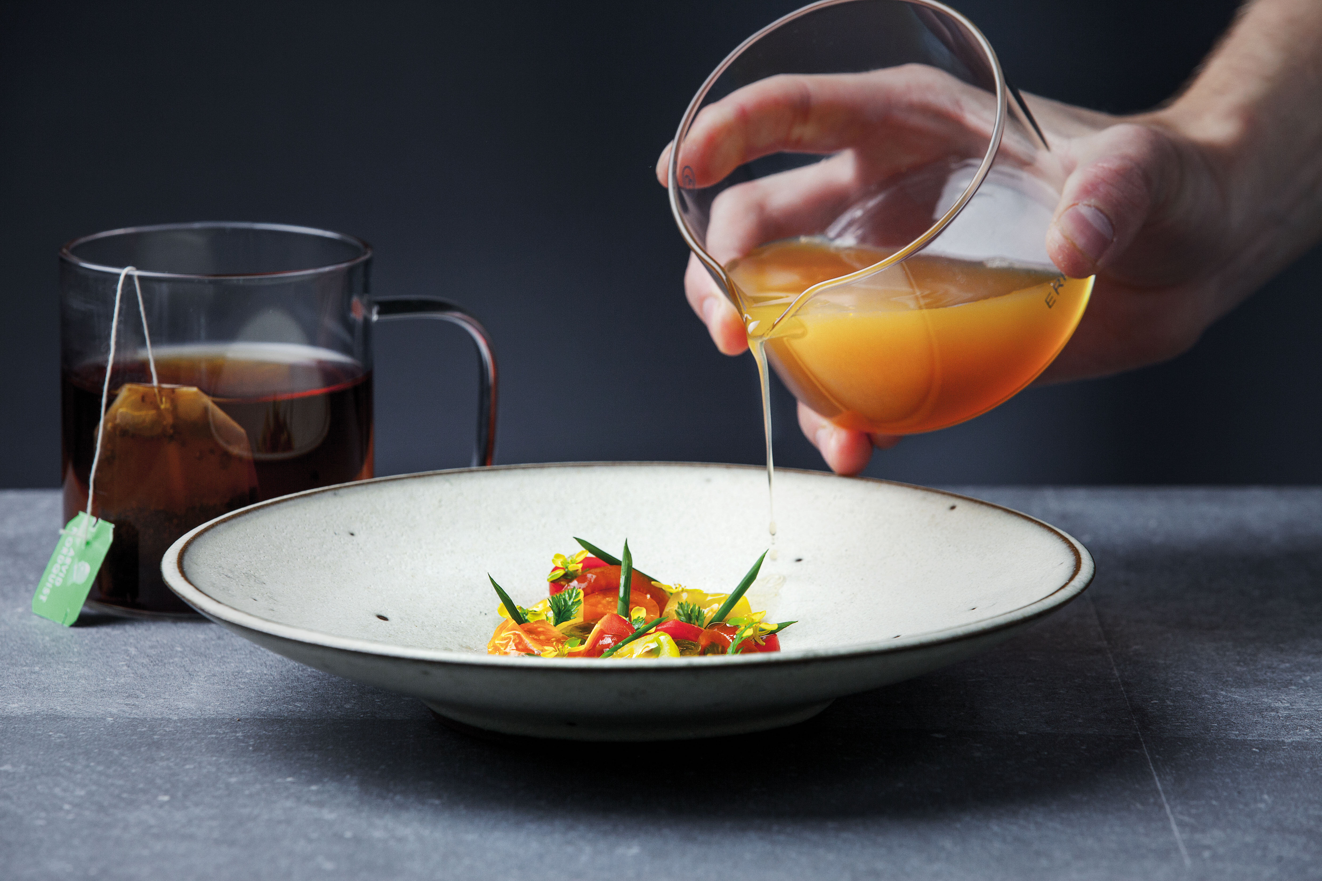 Melvin Glimstål från Juniorkocklandslaget har skapat en sallad smaksatt med te. "Rooibostet Skogsglänta med smak av jordgubb tycker jag är en fantastisk kombination med tomat. Jordgubbar och tomater är så mycket sommar det bara kan bli för mig. Jag tycker om att slå ihop dem och äter gärna jordgubbar och tomat i olika varianter tillsammans. För mig var det rätt självklart att göra en förrätt med tomat där jordgubbstéet får spela en stor roll."