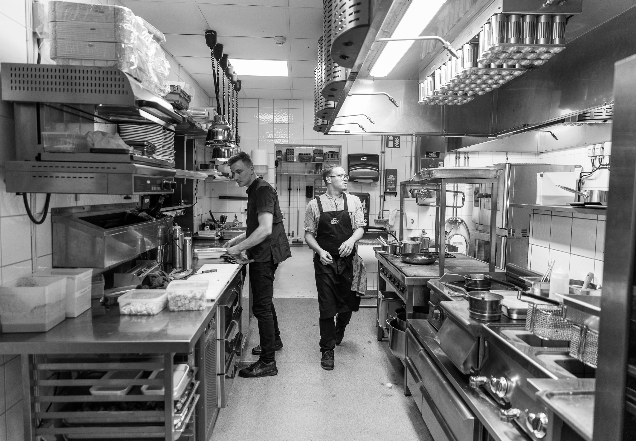 –Du lär dig med åren vad som ska göras för att undvika trångt flöde och att inte faten gapar tomma. Vi har löst det så att vi i köket har våra stationer – en som preppar i köket och en buffévärd som minglar och hjälper gästerna – svarar på frågor, tar upp beställning på varmrätter med mera. Det är lite ovanligt med buffévärdar nu för tiden, det var vanligare förr. Jag tycker det är trevligt och väldigt bra för oss i köket att träffa gästerna. Det blir en del frågor – då det är vi som lagat maten har vi också svaren, säger Marcus.