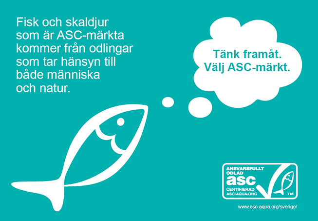 Tänk framåt, välj ASC-märkt. Fisk och skaldjur som är ASC-märkta kommer från odlingar som tar hänsyn till både människa och natur. När du handlar ASC-märkt fisk och skaldjur gör du ett bättre val, för dig själv och för framtiden.