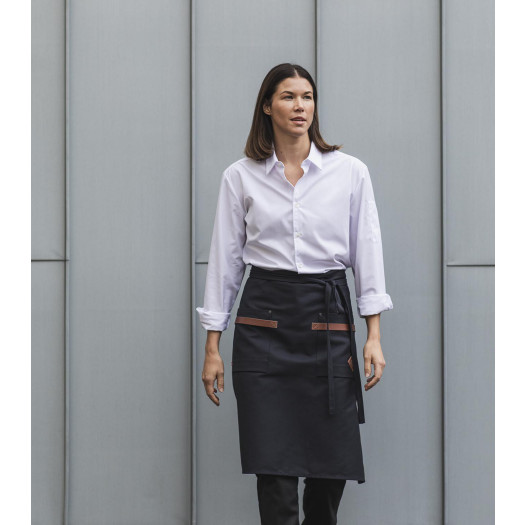 Midjeförkläde i kraftigt canvastyg. Snygga tvättbara detaljer i konstläder vid de två rymliga fickorna. Både snyggt och användbart förkläde till kök/servering/bar eller andra hantverksyrken.Läs mer Visa mindre